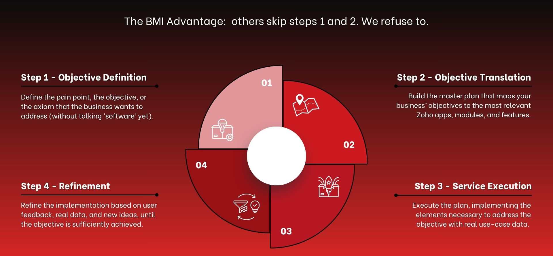 BMI's services are designed to leverage your Zoho suite to its fullest, and are infused with 25 years of management expertise.
