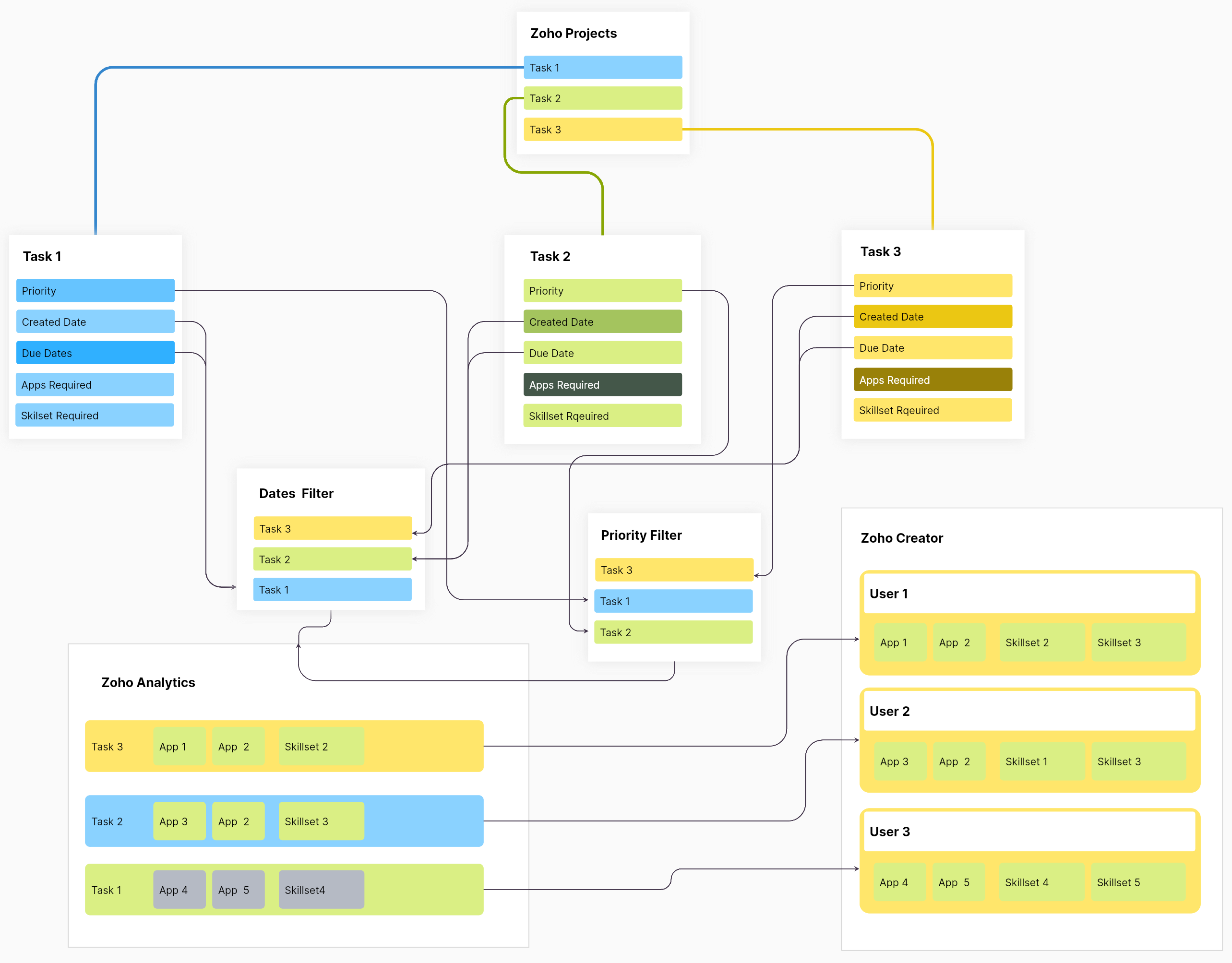 - Custom dashboards developed in Zoho Analytics, integrating data from Zoho Projects and Zoho People.