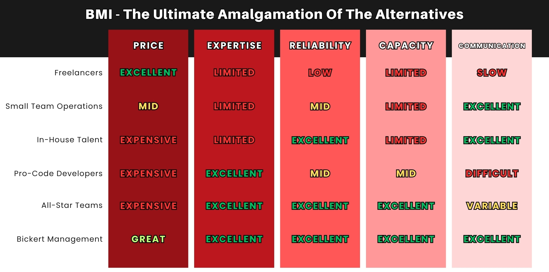Our operating system for delivery keeps two guardrails front and center: do not over-deploy a brain surgeon when a nurse will do, and always work in the smartest order. This combination cuts waste, preserves momentum, and reduces rework. Instead of tossing every request at the same person or piling tasks out of sequence, we match expertise to effort and execute in a logical cadence that sticks. The result is faster throughput, cleaner handoffs, and a lower effective cost per outcome. We call this proprietary system - the result of thousands of hours of development and refinement over years - BMI's RED MED PALS.ur operating system for delivery keeps two guardrails front and center: do not over-deploy a brain surgeon when a nurse will do, and always work in the smartest order. This combination cuts waste, preserves momentum, and reduces rework. Instead of tossing every request at the same person or piling tasks out of sequence, we match expertise to effort and execute in a logical cadence that sticks. The result is faster throughput, cleaner handoffs, and a lower effective cost per outcome. We call this proprietary system - the result of thousands of hours of development and refinement over years - BMI's RED MED PALS.