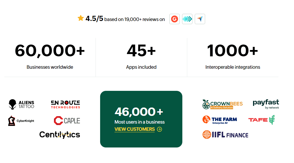 Globally, Zoho serves more than 150 million users and powers companies as large as 46,000+ employees, so scale is not a limit. Over 60,000 businesses operate on Zoho, and it has 4.5 out of 5 stars over 19,000 ratings. In head-to-head deployments, Zoho consistently outperforms competitor software across all industries and company sizes.