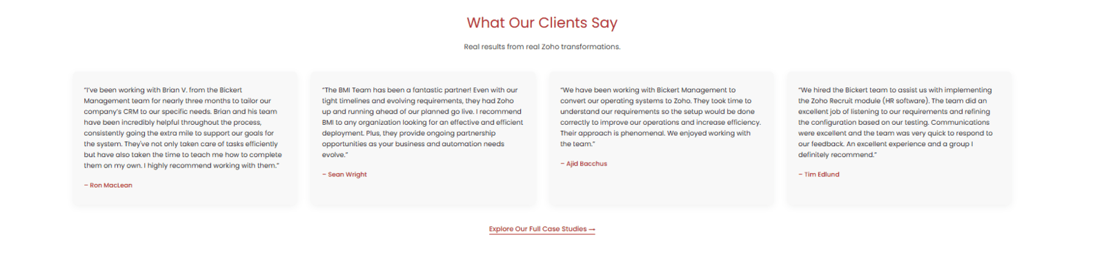 We know our perspective is partial, which is why we point you to what matters most: independent reviews. On Google and Zoho's platforms, clients consistently highlight the results and experience they had with BMI. It's not us talking about us; it's our clients talking to you. Clients who were so impressed they had to leave public feedback speaking to the value, responsiveness, and outcomes we deliver.